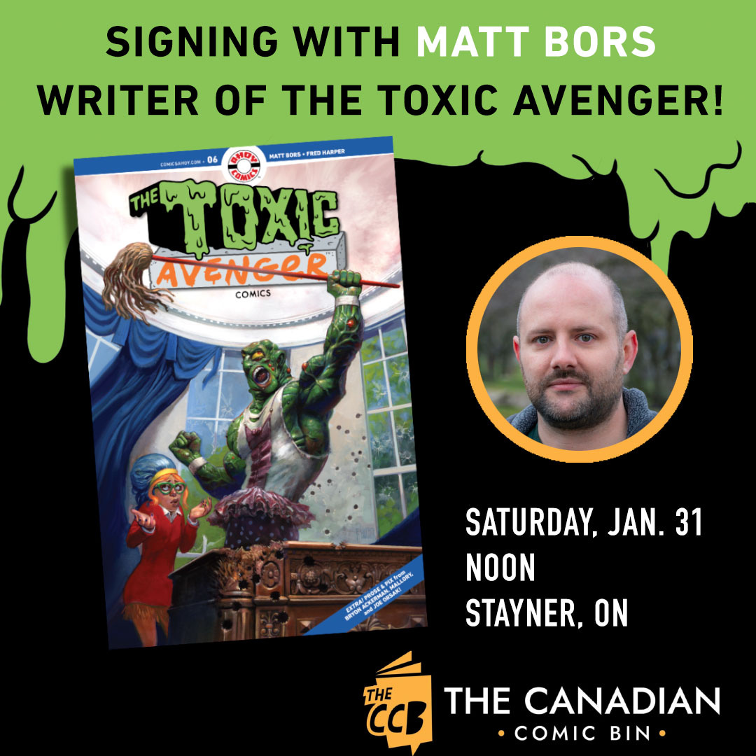 I’ll be signing at the Canadian Comic Bin in Stayner, Ontario, January 31. That is around the release of Toxie Team-Up, the book collection of one-shots from Ahoy pitting Toxie against such culturally influential figures as Jesus Christ and the Justice Warriors.