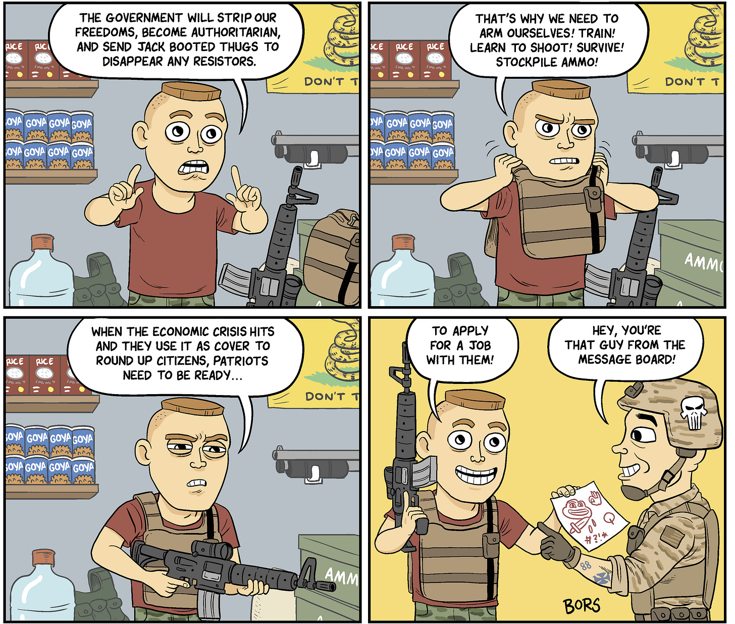 I’m not sure what to even say, except power to those who are out in the streets filming and resisting this shit rather than posting AI memes. Anti-government types seem noticeably absent from all this—or perhaps very present as participants! I was reminded about this cartoon I made in July of 2020.