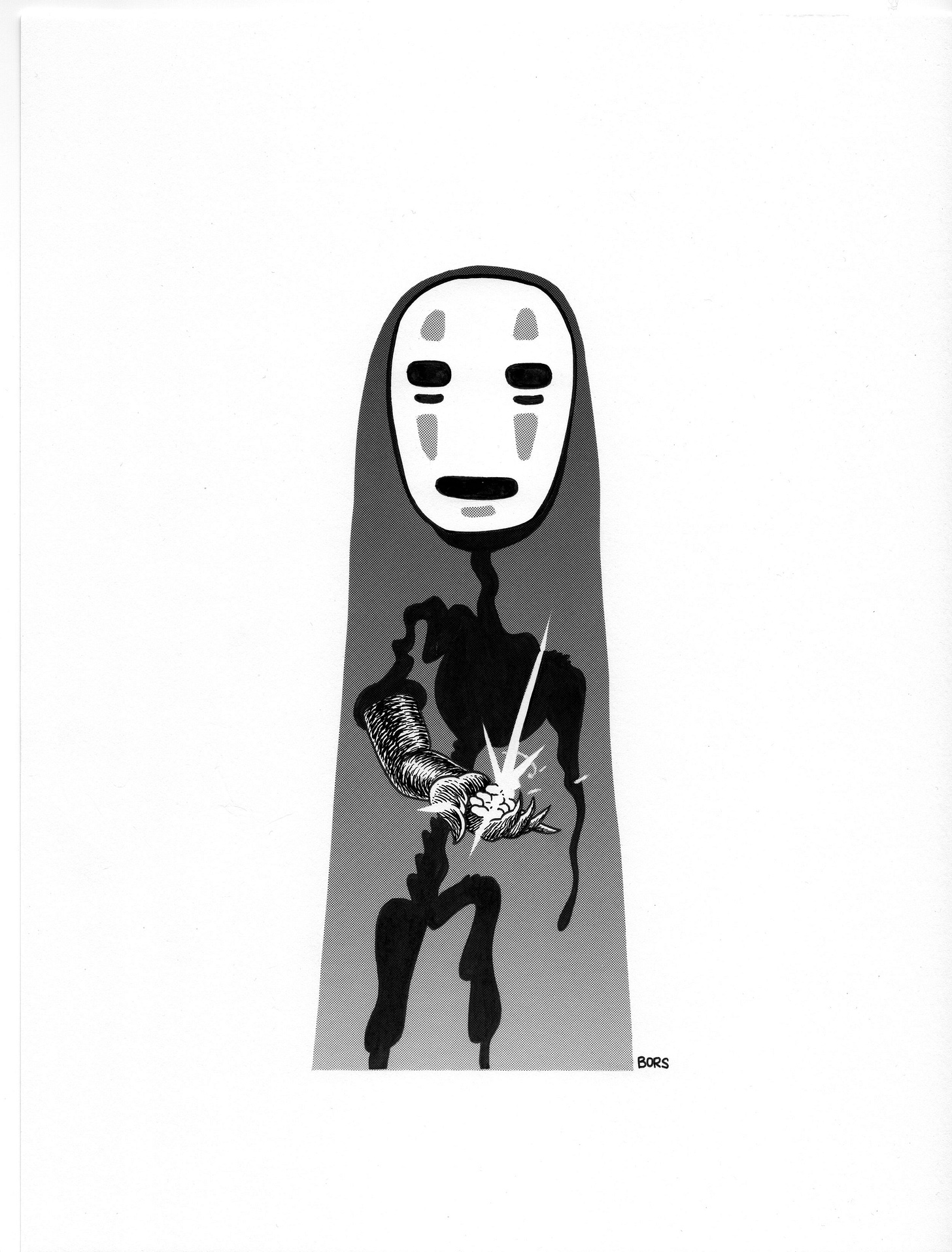 Absolutely fantastic screentone work on the No-Face piece. The way those halftones build up the shadow depth while keeping that eerie emptiness to the character shows a real understanding of what made Miyazaki's orginal design so unsettling. I tried working with physical tones years back and it's way harder than people think to get those transitions smooth without overworking it. The decision to stick with bristol was smart too since it takes ink weight better than most surfaces.