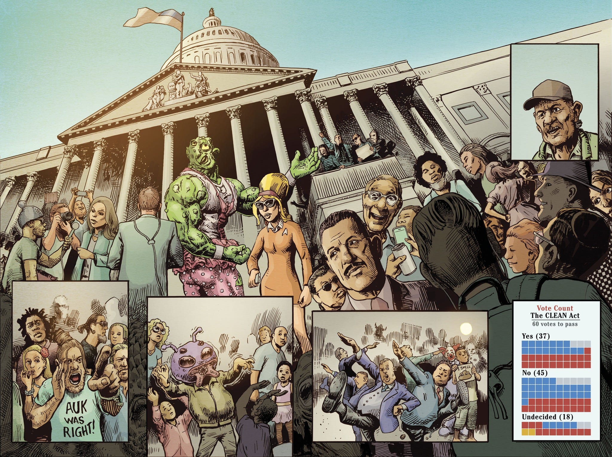 Unlike my political cartoons, however, this is meant to tell a real story—a violently entertaining one, I hope, with turns you won’t see coming, about sicko elites and phony hope in the halls of power. The story was conceived of years ago when I initially pitched the Toxie comics to Ahoy and Troma, though I would certainly consider it… relevant. It all begins when our boy Toxie is summoned to Capitol Hill to testify before the Senate…