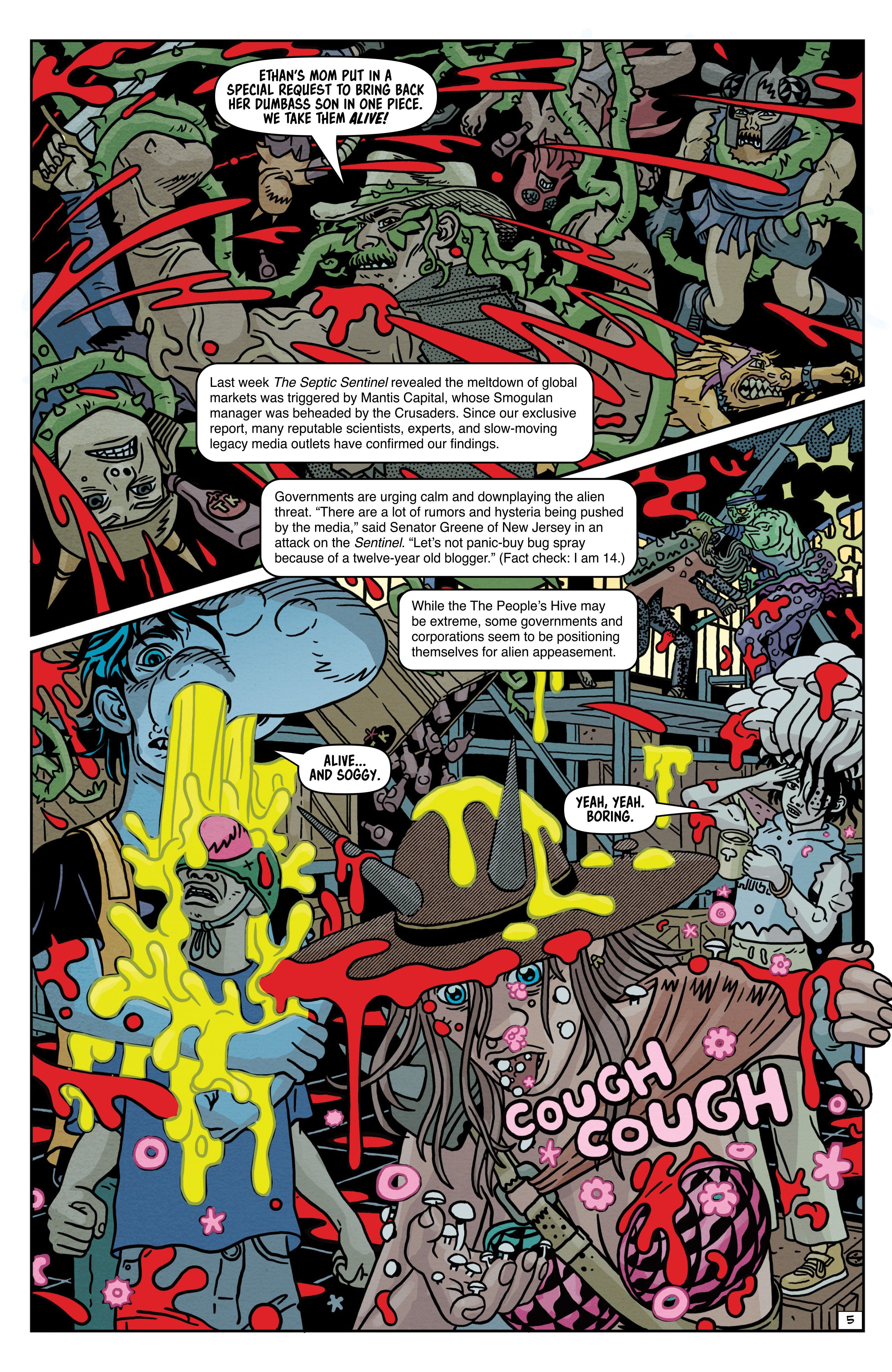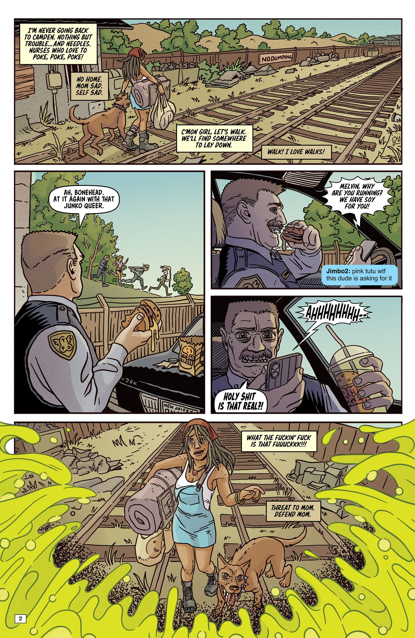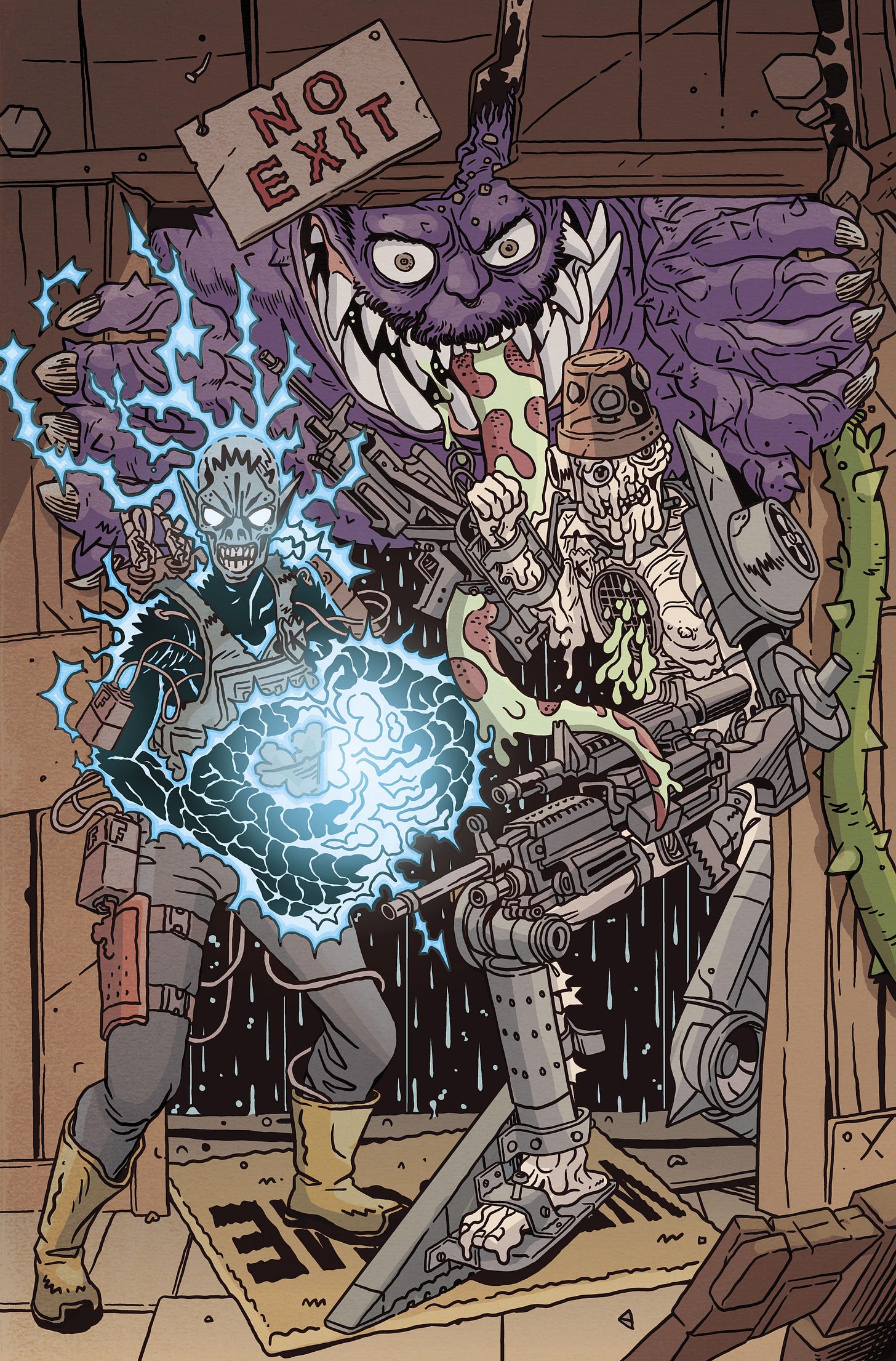 You can read four pages of the story below, followed by five pages of Toxic Crusaders #3, which drops Wednesday. This issue focuses on Junkyard, a homeless woman merged with her dog by toxic waste, and the police who try to evict the Crusaders from their home.